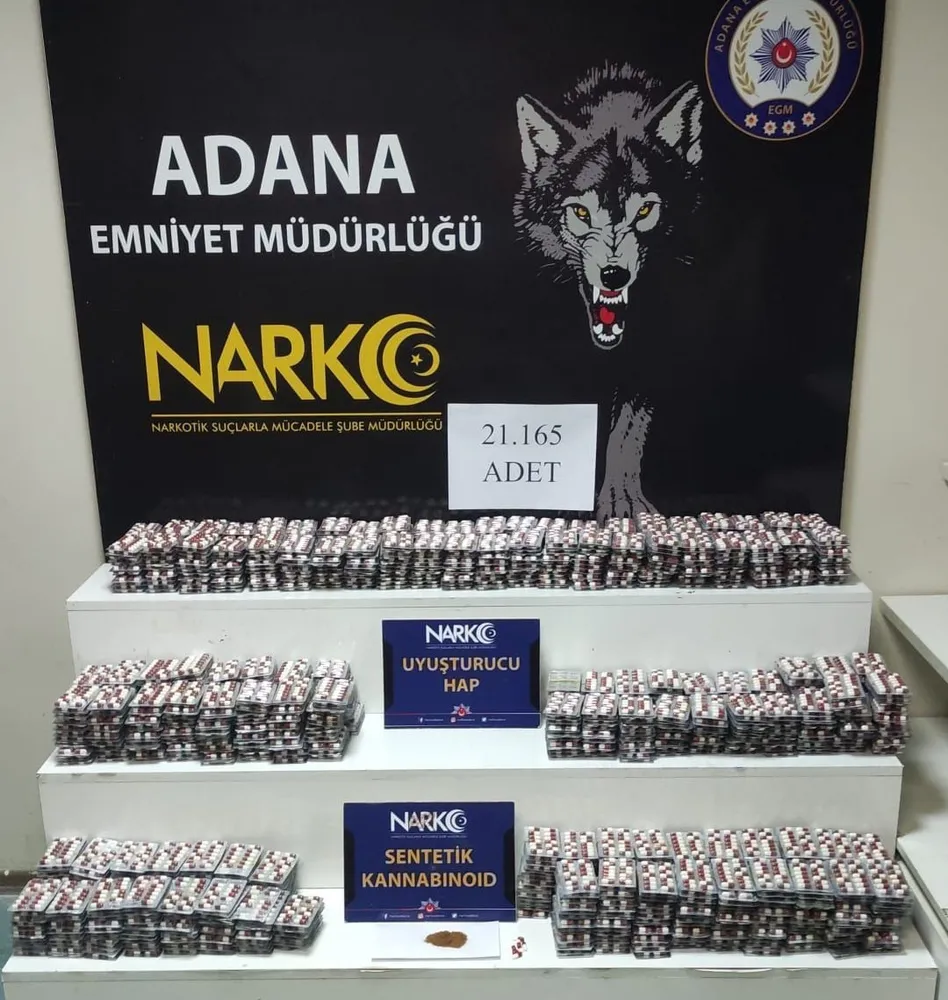 Adana Emniyet Müdürlüğü Narkotik Suçlarla Mücadele Şube Müdürlüğü ekipleri, uyuşturucuyla mücadele kapsamında çalışma yaptı. Ekiplerin merkez Seyhan ilçesine bağlı Namık Kemal Mahallesi’nde bir ikamete düzenlediği operasyonda yapılan aramada 21 bin 165 uyuşturucu hap ile 3,75 gram bonzai ele geçirildi. Olayla ilgili gözaltına alınan T.Y. çıkarıldığı mahkemece tutuklandı. Şüphelinin ifadesinde hapları toplu şekilde ucuza satın aldığını ve kullanıcı olduğunu söylediği öğrenildi.