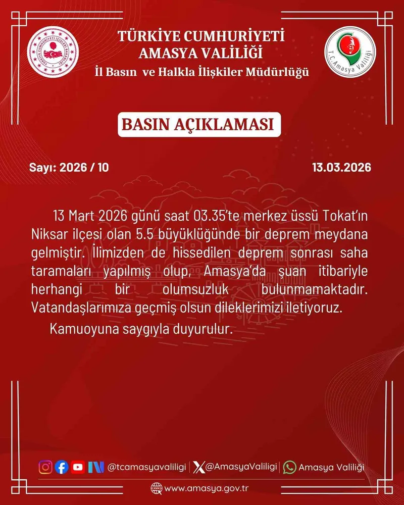 Açıklamada şu ifadelere yer verildi; "13 Mart 2026 günü saat 03.35’te merkez üssü Tokat’ın Niksar ilçesi olan 5.5 büyüklüğünde bir deprem meydana gelmiştir.