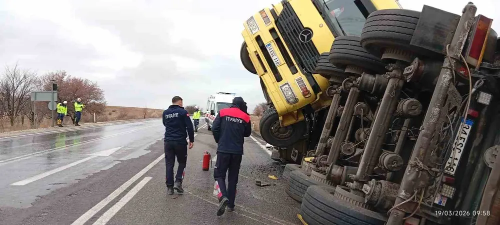 Afyonkarahisar’da yağışlı hava nedeniyle kontrolden çıkarak devrilen balık yemi yüklü tırın sürücüsü yaralandı.