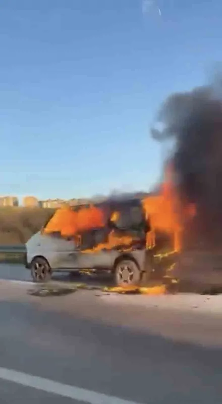 Bursa çevre yolunda seyir halindeki hafif ticari araç alev aldı. Yangın, itfaiye ekiplerinin müdahalesiyle söndürüldü.