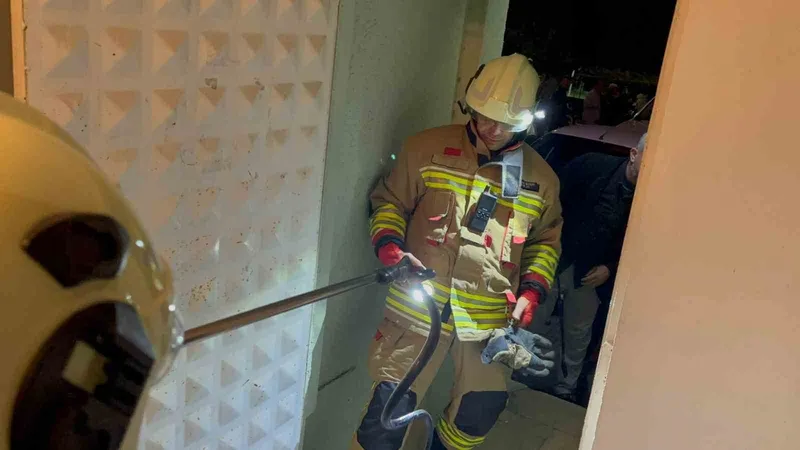 Hatay’da camide görülen yılan, depoda özel aparatla itfaiye ekiplerince yakalandı.