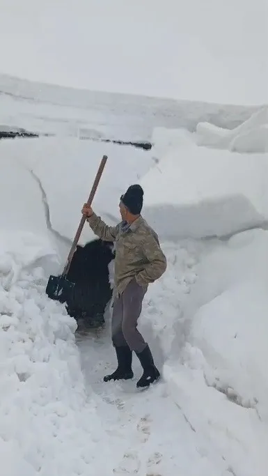 Kars’ta evinin önündeki kar birikintilerini temizleyen şahsın düşen devasa kar kütlesinin altında kalmaktan saniyelerle kurtulduğu anlar kameraya yansıdı.
