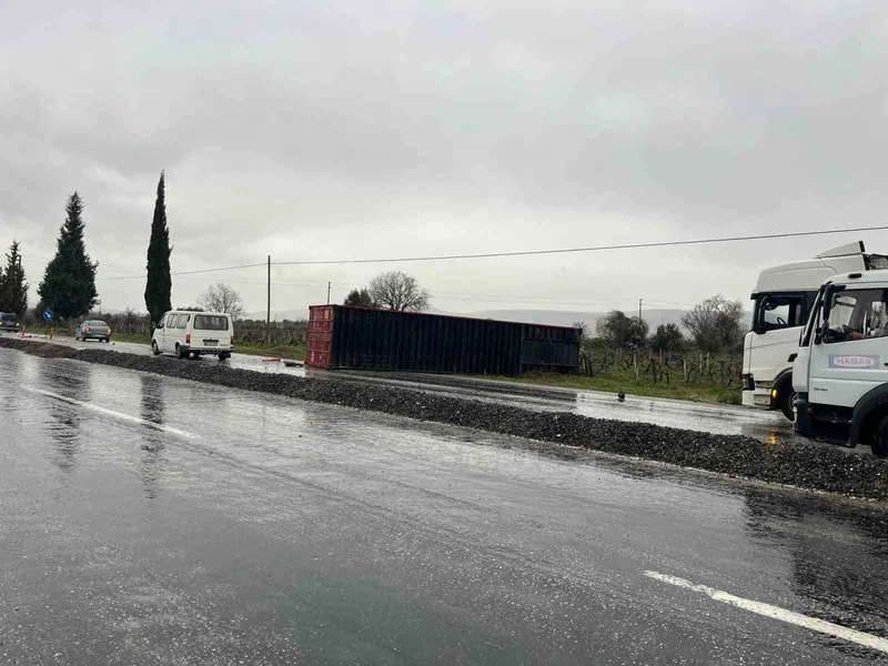 Kaza, Denizli’nin Buldan ilçesi Oğuzköy Mahallesi Denizli-Salihli karayolu üzerinde meydana geldi. Edinilen bilgilere göre, plakası ve sürücüsü henüz öğrenilemeyen TIR, yağmur nedeniyle kayganlaşan zeminde sürücüsünün direksiyon hakimiyetini kaybetmesi sonucu savruldu. TIR’ın dorsesi yola çıkarken, kaza nedeniyle yol bir süre trafiğe kısmen kapatıldı. İhbar üzerine bölgeye sevk edilen ekipler tarafından gerekli güvenlik önlemleri alınırken, yolda kontrollü geçiş sağlandı. Meydana gelen kazada ölen ya da yaralanan olmazken, dorsenin yoldan kaldırılmasının ardından trafik akışı normale döndü.
