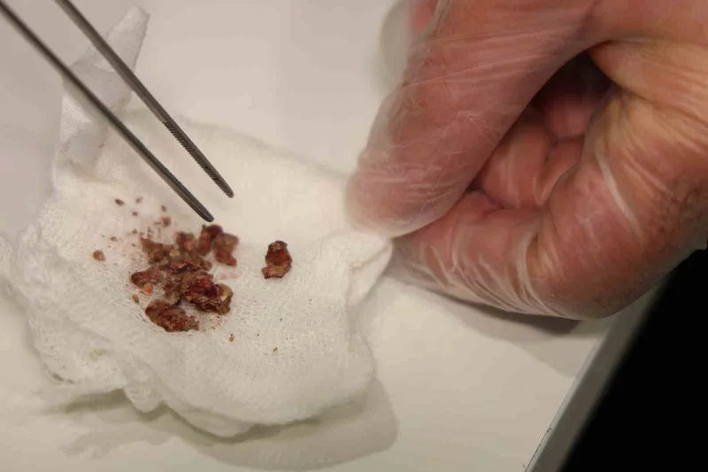 Elazığ’da burun estetiği için ameliyata alınan bir hastada, operasyon sırasında nadir görülen bir durumla karşılaşıldı. Kulak Burun Boğaz (KBB) Doktoru Op. Dr. Erhan Demirbağ tarafından gerçekleştirilen ameliyatta, burun boşluğu içinde tıpta "rinolit" olarak adlandırılan taş oluşumları tespit edildi. Burunda şekil bozukluğu şikayetiyle başvuran hastanın yapılan tetkiklerinin ardından estetik ameliyatına başlandı. Ameliyat sırasında burun içinde rutin dışı sert oluşumlar fark edildi. Yapılan değerlendirmede bu yapıların, uzun yıllar içinde yabancı cisim etrafında kalsiyum ve magnezyum birikmesi sonucu oluşan rinolitler olduğu belirlendi. Tespit edilen taşlar endoskopik yöntemle tamamen çıkarıldı, hasta sağlığına kavuştu.