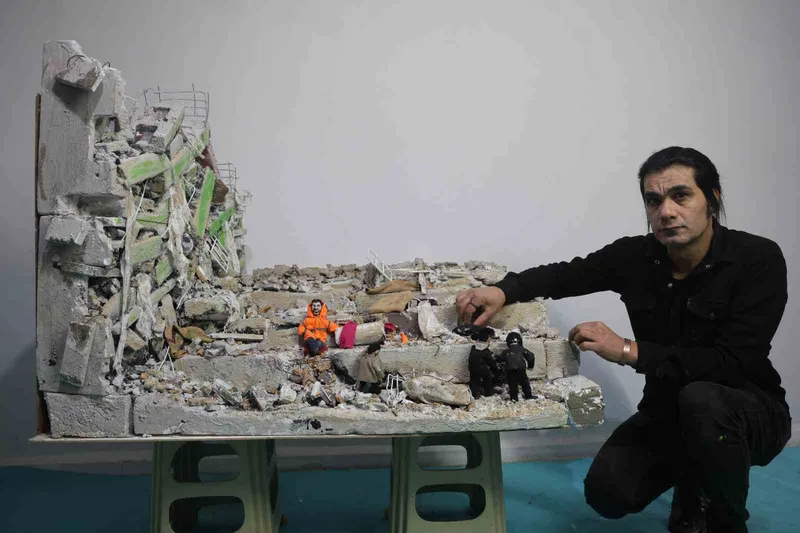 Hatay’da asrın felaketinde kız kardeşini kaybeden ve iki çocuk babası olan 47 yaşındaki Mehmet Kocaman, Kahramanmaraş’ta depremde enkaz altında kalan evladının elinden tutan ve bir an kızının elini bırakmayan Mesut Hançer’den etkilenerek 3 ay süren çalışmayla deprem minyatürü yaptı.