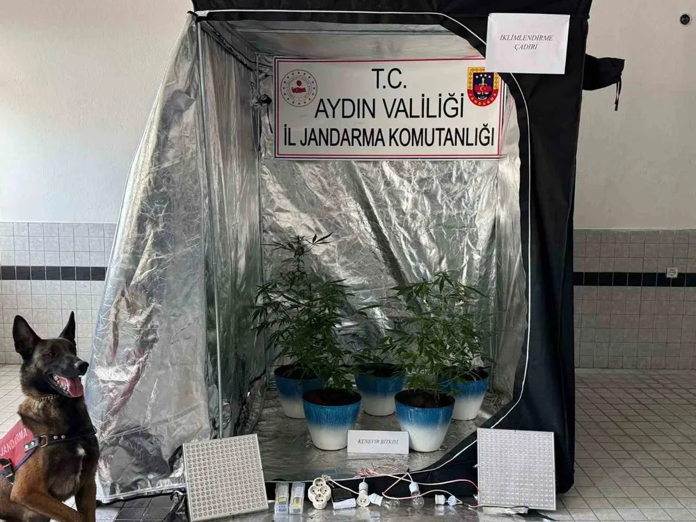 Aydın İl Jandarma Komutanlığı Narkotik Suçlarla Mücadele Şube Müdürlüğü ve Buharkent İlçe Jandarma ekiplerince uyuşturucu madde ticareti yapan şahıslara yönelik yürütülen çalışmalar neticesinde S. G. (22) isimli şahsın evinde arama yapıldı. Yapılan aramada özel olarak yapılan düzenek içerisinde 8 kök kenevir bitkisi, 1 adet 2x1.80 metre iklimlendirme çadırı, 2 adet LED aydınlatma, 1 adet 4’lü priz, 4 adet uzatmalı ampul, 2 adet pH ölçme cihazı, 1 adet termometreye el konuldu.