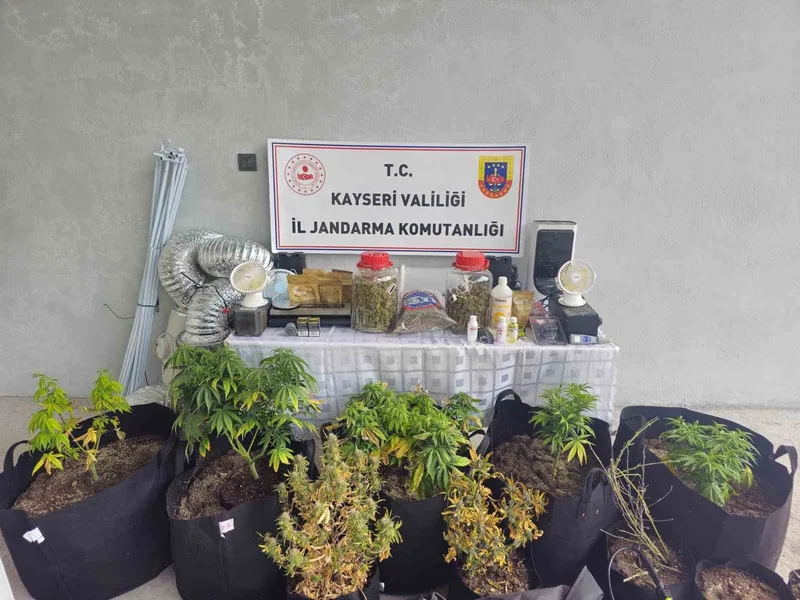 Kayseri İl Jandarma Komutanlığı Narkotik Suçlarla Mücadele Şube Müdürlüğü, İstihbarat Şube Müdürlüğü ve Kocasinan İlçe Jandarma Komutanlığı ekipleri tarafından uyuşturucuyla mücadele kapsamında çalışma başlatıldı. Çalışmalar kapsamında evinde uyuşturucu madde yetiştirdiği tespit edilen T.U.’nun evine operasyon düzenleyen ekipler, 2 kilo 470 gram uyuşturucu madde, 10 kök kenevir bitkisi, 1 adet iklimlendirme çadırı, 1 adet aydınlatma sistemi, 1 adet oda nemlendiricisi, 1 adet soğutucu ve iklimlendirme sistemine ait muhtelif malzemelerle ele geçirildi.