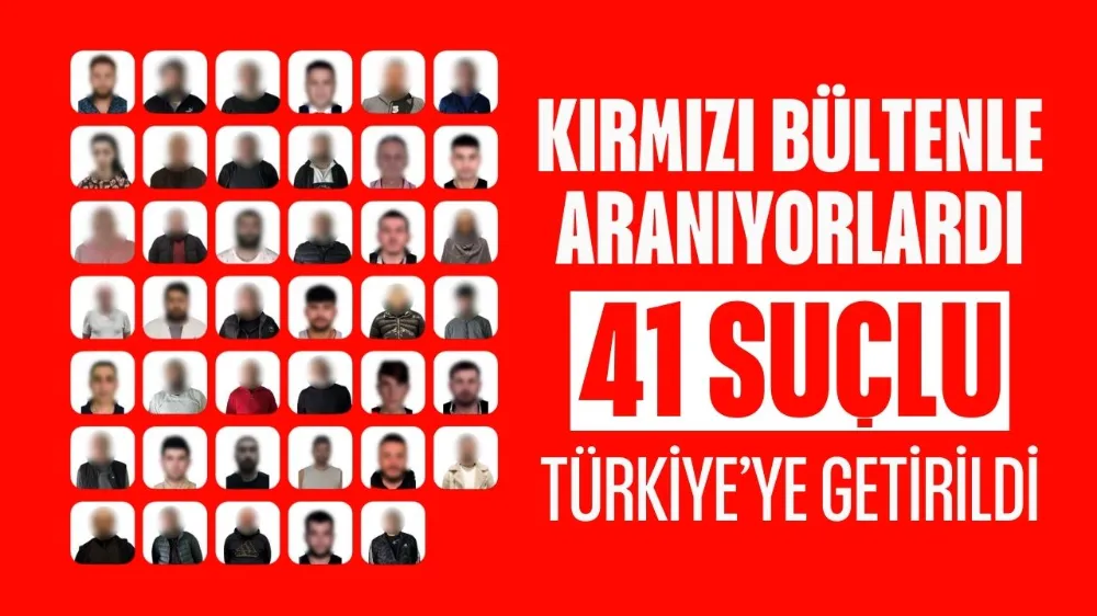 İçişleri Bakanlığı, yurt dışına kaçan ve haklarında arama kararı bulunan suçlulara yönelik yürütülen çalışmalar kapsamında önemli bir gelişmeyi duyurdu. Yapılan açıklamaya göre; kırmızı bültenle aranan 23 kişi ile ulusal seviyede aranan 18 kişi olmak üzere toplam 41 suçlu, Türkiye’ye geri getirildi.