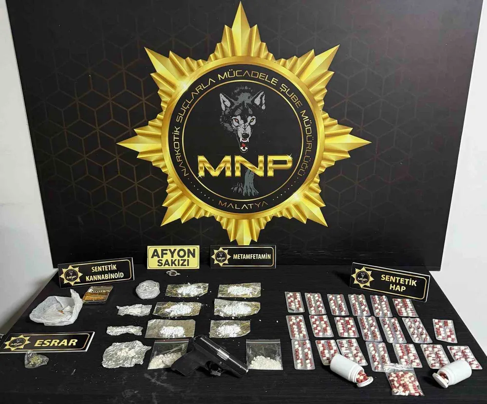 Malatya’da İl Emniyet Müdürlüğü Narkotik Suçlarla Mücadele Şube Müdürlüğü ekiplerince sokak satıcılarına yönelik operasyon düzenlendi. Belirlenen 7 şüpheli şahsa ait adreslerde yapılan aramalarda 472 adet sentetik ecza, 60 gram metamfetamin, 8 gram sentetik kannabinoid, 3 gram esrar, 2 gram afyon sakızı ile 1 adet ruhsatsız tabanca ele geçirildi.
