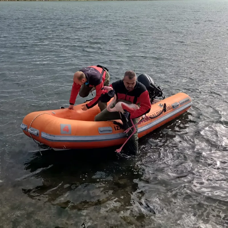 İzmir Büyükşehir Belediyesi İtfaiye Dairesi Başkanlığı, İnciraltı Barış Manço Köprüsü yakınlarında bir flamingonun ayağına olta misinası dolandığı ihbarı üzerine ekiplerini hızla bölgeye sevk etti. İtfaiye dalgıçlarından oluşan 4 kişilik uzman ekip, flamingonun bulunduğu alanda kurtarma çalışması başlattı. Denizde ve kıyı hattında yürütülen dikkatli ve kontrollü operasyon sonucunda flamingoya ulaşıldı. Ayağına dolanan misina nedeniyle hareket kabiliyeti kısıtlanan flamingo, bota alınarak güvenli şekilde karaya çıkarıldı. Ekipler, hayvana zarar vermeden misinayı çıkardı.