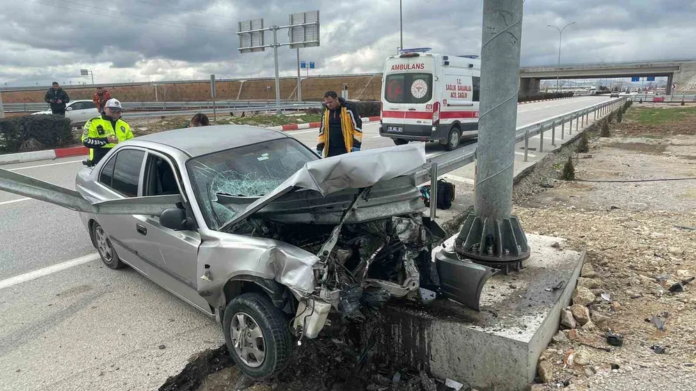 Karaman’da sürücüsünün direksiyon hakimiyetini kaybettiği otomobil demir bariyere ok gibi saplandı. Kazada karı koca ölümden döndü.
