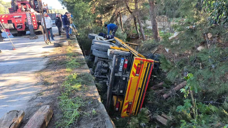 Muğla’nın Bodrum ilçesinde otomobile çarpıp şarampole devrilen vincin sürücü yaralandı.