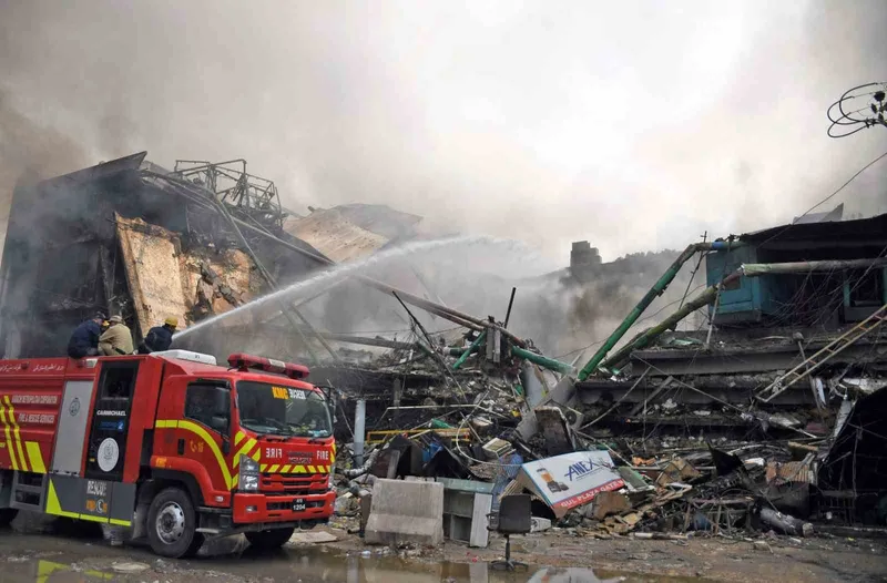 Pakistan basını, yangının bir çiçekçide başladığını ve 18 saatten fazla süredir söndürülemediğini ifade etti. İtfaiye Şefi Muhammed Humayun, zemin kattaki tüm dükkan ve depoların alevlere teslim olduğunu belirterek, arama-kurtarma çalışmalarının binanın bir kısmının çökmesi ve içeride biriken duman nedeniyle oldukça riskli olduğunu ifade etti. Humayun, arama-kurtarma operasyonunun ancak yangın tamamen kontrol altına alındıktan sonra devam edeceğini aktardı.