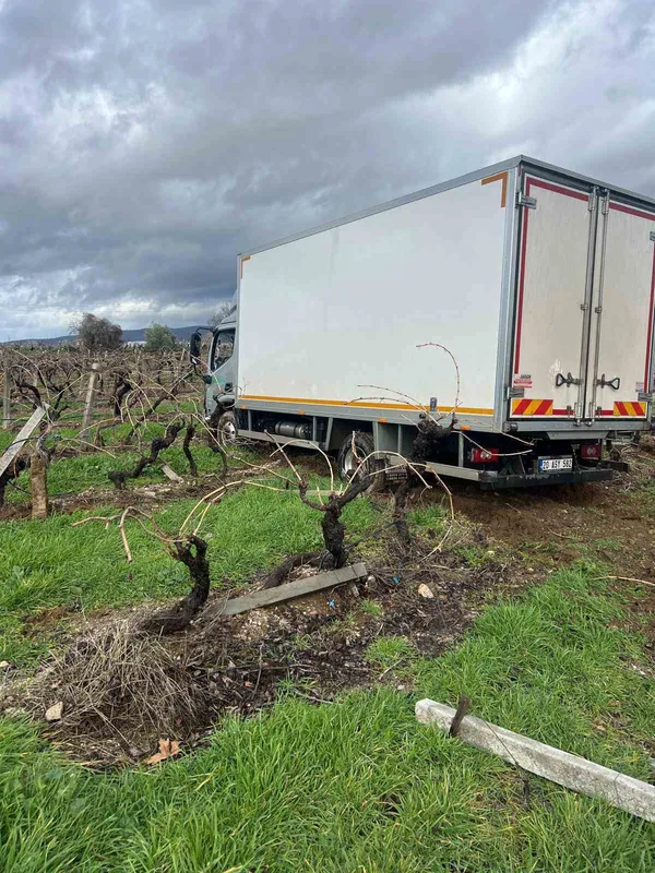Denizli’nin Buldan ilçesinde, kazalarla sık sık gündeme gelen Buldan karayolunda meydana gelen trafik kazasında bir kamyon üzüm bağına girdi.