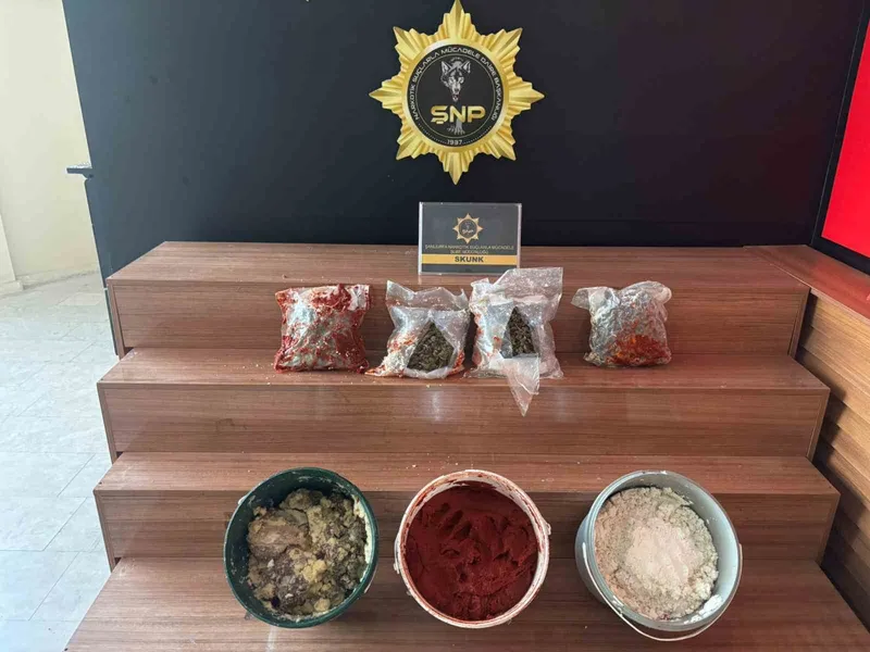 Şanlıurfa İl Emniyet Müdürlüğü Narkotik Suçlarla Mücadele Şube Müdürlüğü ekiplerince düzenlenen operasyonda, bir araçta yapılan aramada salça ve peynir kovaları içine gizlenmiş 4 parça halinde 2 kilo 400 gram skunk ele geçirildi.