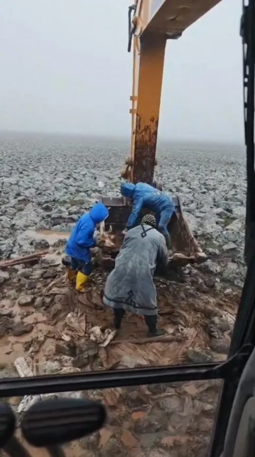 Şanlıurfa’nın Viranşehir ilçesinde etkili yağışların ardından dağlık alanda çamura saplanan inek, kepçe yardımıyla kurtarıldı.