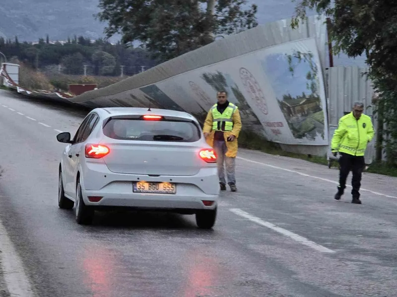 İzmir’in Selçuk ilçesinde fırtına nedeniyle büyük reklam panoları ve demir konstrüksiyonlar anayola devrildi. O esnada yoldan geçen herhangi bir aracın bulunmaması muhtemel bir kazanın önüne geçti.