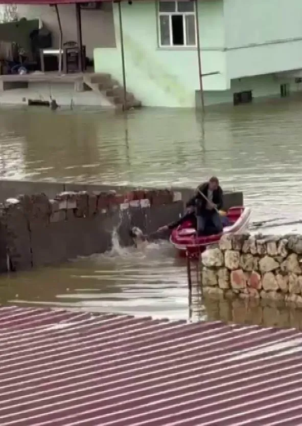Diyarbakır’ın Kocaköy ilçesinde sağanak yağış nedeniyle meydana gelen taşkında evde mahsur kalan köpek, bota binen vatandaşların yardımıyla kurtarıldı.