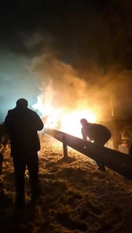 Sivas’ta bir tırın yakıt deposunda başlayan yangın paniğe neden oldu. Alevlere müdahale etmek isteyen vatandaşlar, elleriyle kar atarak söndürmeye çalıştı.