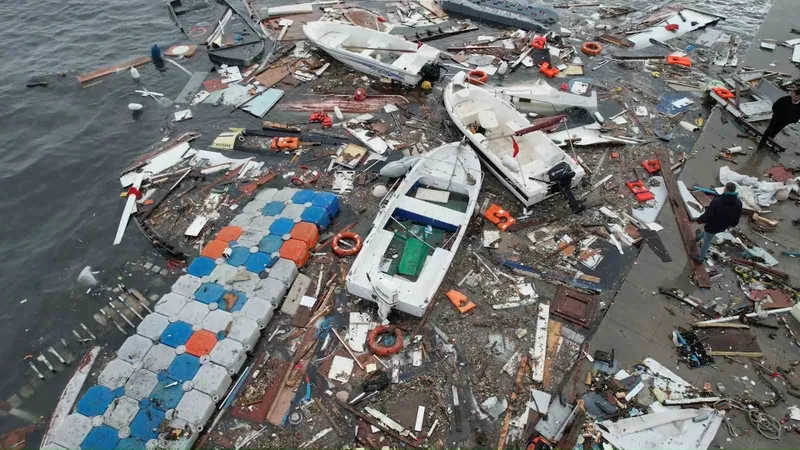 Fırtına sonrası sahil kesiminde oluşan tahribat ve teknelerde meydana gelen ağır hasar havadan görüntülendi. Dronla kaydedilen görüntülerde, alabora olan tekneler, parçalanan gövdeler ve sahil boyunca oluşan hasarın boyutu net şekilde ortaya çıktı.