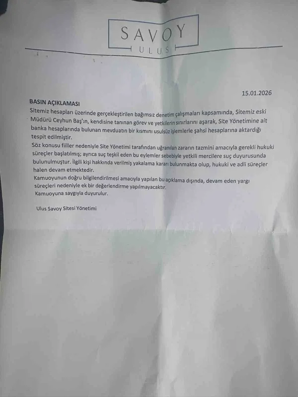 Açıklamada, "Sitemiz hesapları üzerinde gerçekleştirilen bağımsız denetim çalışmaları kapsamında, Sitemiz eski Müdürü Ceyhun Baş’ın, kendisine tanınan görev ve yetkilerin sınırlarını aşarak, site yönetimine ait banka hesaplarında bulunan mevduatın bir kısmını usulsüz işlemlerle şahsi hesaplarına aktardığı tespit edilmiştir" denildi.