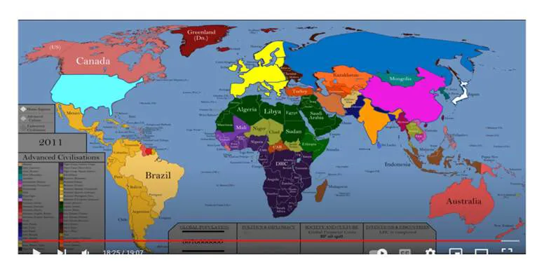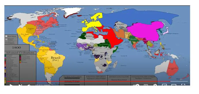 1800 yılında dünyadaki büyük devlet sayısı (Avrupa’yı bir bütün olarak ele alırsak) altıdır; Avrupa’da önce Fransa sonra İngiltere önderliğinde Avrupa ülkeleri; Rusya İmparatorluğu, Çin İmparatorluğu, Japon İmparatorluğu, Kaçar Hanedanı’nın yönettiği İran ve Güneybatı Avrupa’yı, Kuzey Afrika ve Arabistan Yarımadasını denetimi altına alan Osmanlı Devleti. Haritada dikkat çeken husus, bugünün Orta Asya devletlerinin yer aldığı bölgenin o sırada Rus egemenliği altında olmamasıdır. Ancak, bir süre sonra bu topraklar da Rusya İmparatorluğuna katılır.