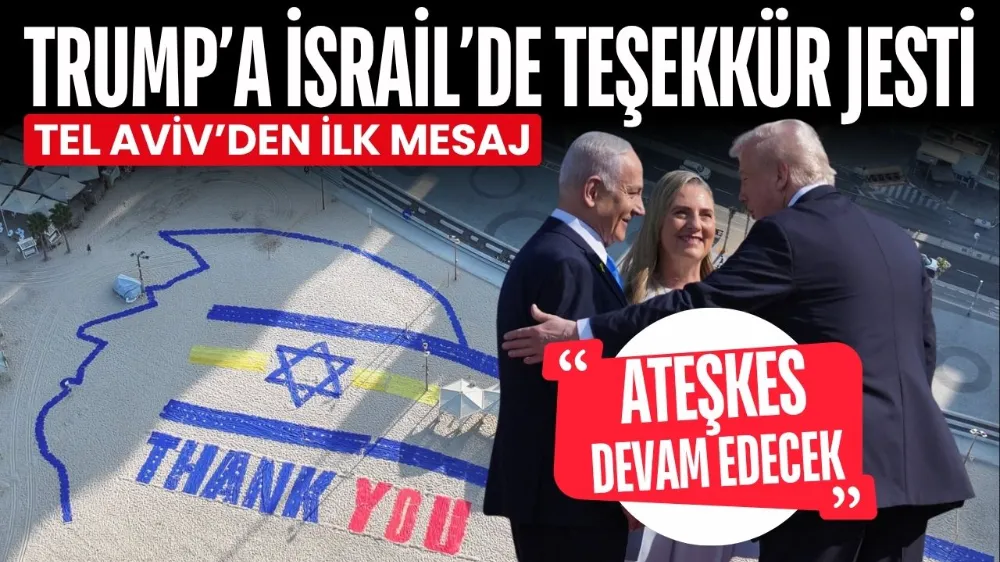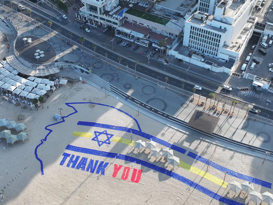Tel Aviv sahiline, kumların üzerine üç futbol sahası büyüklüğünde bir alana “Teşekkürler” yazısı yerleştirildi. Ayrıca, yazı içinde Trump’ın silüetine de yer verildiği belirtildi. Aynı saha üzerinde “Evinize hoş geldiniz” gibi ifadeler de yer aldı; bu bölümde Hamas tarafından serbest bırakılan esirler için hazırlanmış mesajlar yer alıyordu.