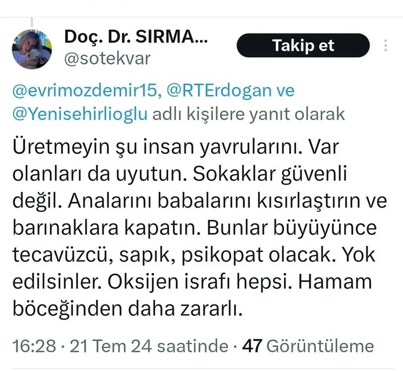 Ankara Üniversitesi İletişim Fakültesi’nde akademisyen olarak görev yapan Doç. Dr. Sırma Oya Tekvar’ın sosyal medya hesabı üzerinden çocukları hedef alan sözleri ortaya çıktı. Tekvar’ın sosyal medya hesabından çocuklara yönelik olarak, "Üretmeyin şu insan yavrularını, var olanları da uyutun" dedi. Tekvar’ın düzenli olarak hayvan hakları savunması adı altında, çocukları hedef aldığı paylaşımlarda bulunduğu ortaya çıktı. Tekvar, sokak hayvanları ile alakalı çıkan kanunun ardından, "Hayvanlara biçtiğiniz kader, çocuğunuzun kaderi olsun" dedi. Ayrıca Üniversite’de akademisyen olarak görev yapan Tekvar öğrencileri hedef alarak, "O arsız, edepsiz, histerik çocukların psikolojisini bozarken aldığım hazzı anlatamam. Gayet de çocuk sevmiyorum" dediği ortaya çıktı. Tekvar’ın sosyal medyadan yaptığı paylaşımlarına vatandaşlardan tepki geldi.
