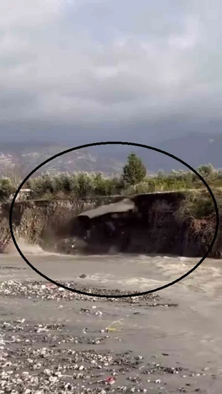 Hatay’da etkili olan aşırı yağışla birlikte dere yatağının yanı başında bulunan yolun çöktüğü anlar kameraya yansıdı.