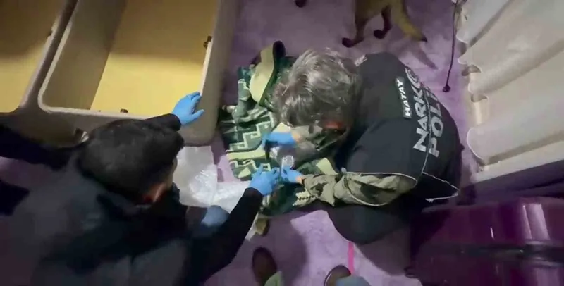 Hatay’da gerçekleştirilen operasyonda bazanın altında battaniyeye zulalanan uyuşturucu maddeyi narkotik köpeği buldu.