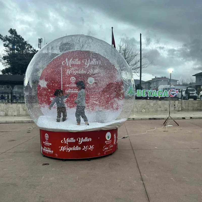Beyağaç Belediyesi vatandaşların yılbaşı hatıralarını renkli şekilde ölümsüzleştirmeleri için Beyağaç Çarşı Meydanına dev kar küresi yerleştirdi.