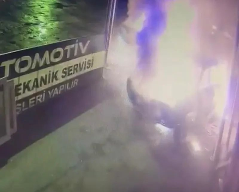 Öte yandan, 1 gün önce oto tamircisinin önüne bırakılan ve birden bire alev alan otomobilde başlayan yangın güvenlik kameralarına yansıdı. 2 otomobilin küle döndüğü yangın saniye saniye kaydedildi.
