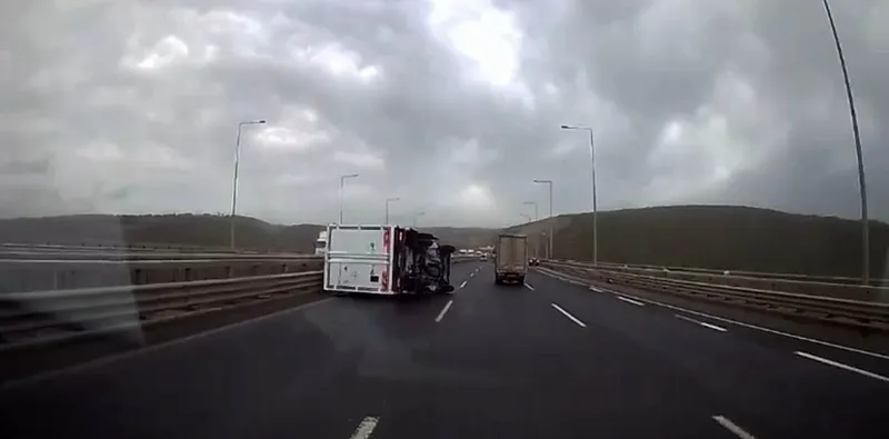 Kuzey Marmara Otoyolu’nun Kocaeli geçişinde seyir halindeki kamyonetin fırtına nedeniyle devrildiği anlar güvenlik kamerasına yansıdı.