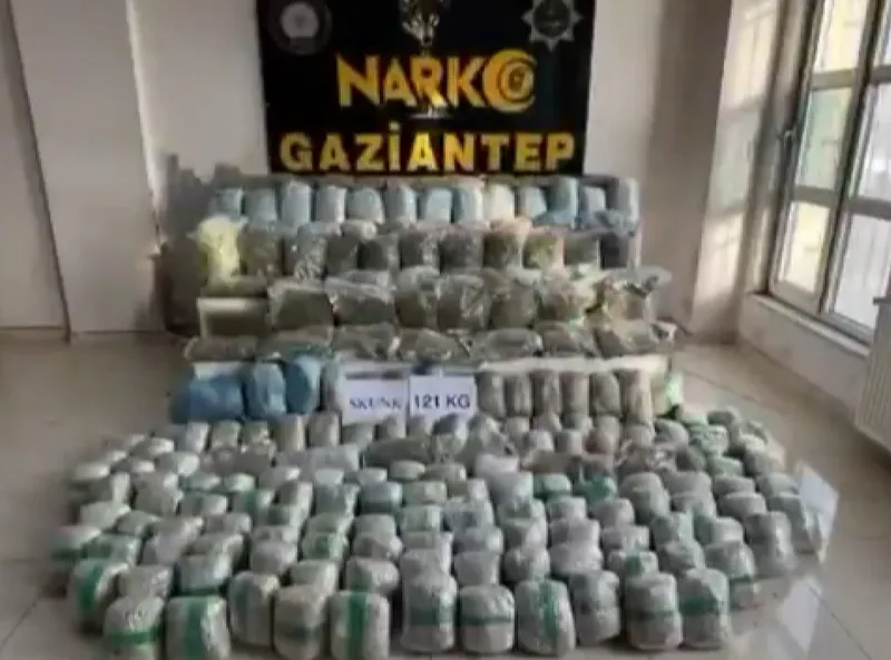 Gaziantep’te İl Emniyet Müdürlüğü Narkotik Suçlarla Mücadele Şube Müdürlüğü ekipleri ve Cumhuriyet Başsavcılığı koordinesinde uyuşturucu tacirlerine yönelik operasyon yapıldı. Operasyon çerçevesinde belirlenen bir araçta arama yapıldı. Hassas burunlu dedektör köpek destekli aramalar sonucunda tırdaki ürünlerin arasına gizlenmiş halde 121 kilo skunk ele geçirildi.