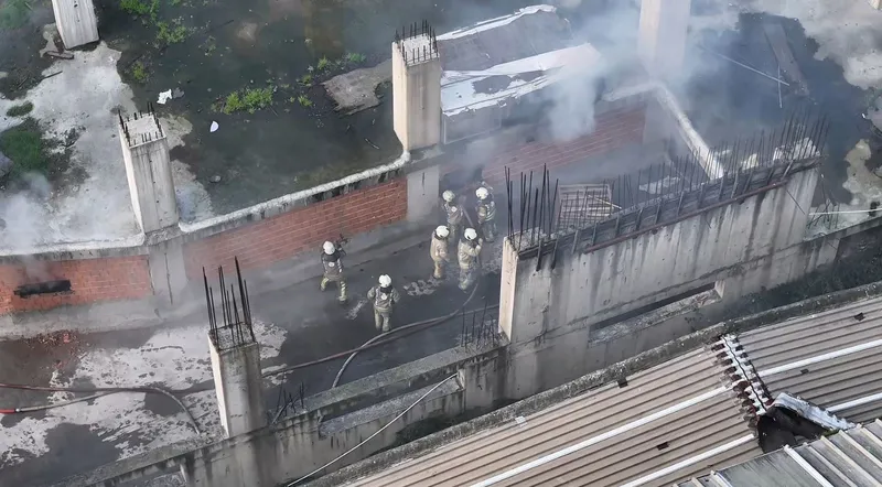 Gaziosmanpaşa’da bir işyerinde yangın çıktı. İtfaiyecilerin yangına müdahalesi sürerken, ekiplerin duvarı balyozla kırarak çalışma yapması dron kamerasına yansıdı.