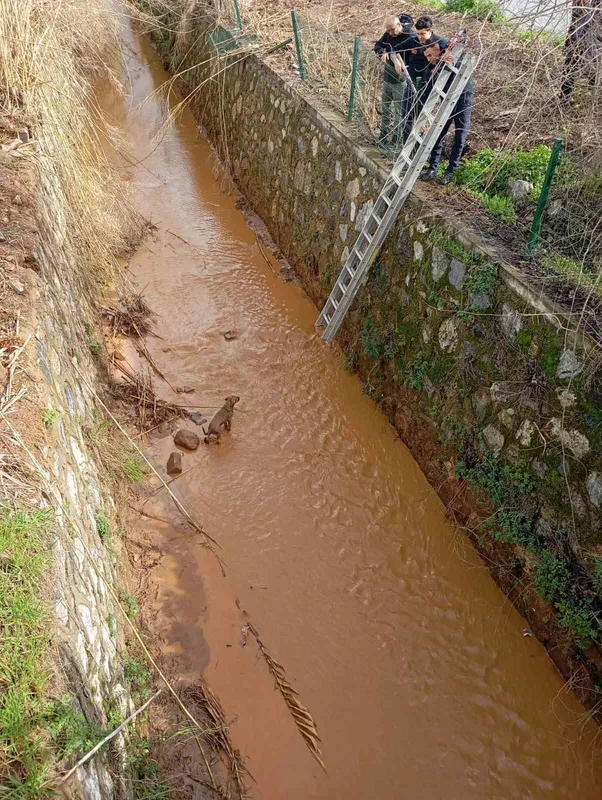Aydın’ın Efeler ilçesinde sulama kanalına düşen köpeği Aydın Büyükşehir Belediyesi İtfaiye Daire Başkanlığı ekipleri kurtardı.