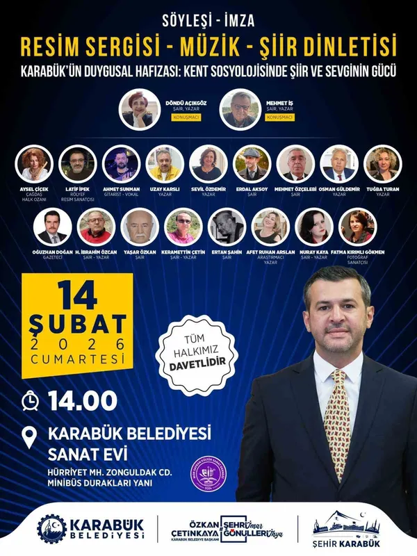14 Şubat Cumartesi günü saat 14.00’te Karabük Belediyesi Sanat Evi’nde gerçekleştirilecek programda; şairler, yazarlar, sanatçılar ve araştırmacılar sanatseverlerle bir araya gelecek. Etkinlikte, şiirin ve sanatın kent kültürü üzerindeki etkisi, toplumsal hafıza ve sevgi kavramı üzerinden ele alınacak.