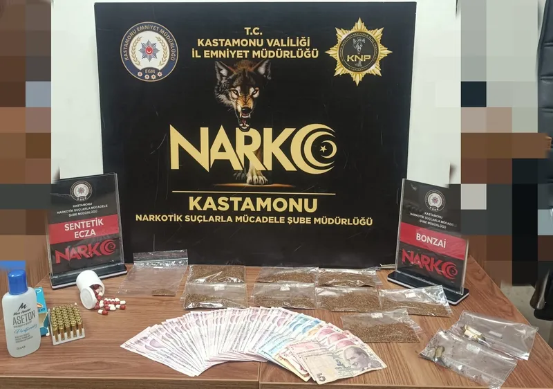 Edinilen bilgiye göre, Kastamonu İl Emniyet Müdürlüğü ekipleri tarafından uyuşturucuyla mücadele kapsamında M.A. isimli şahsın üstünde ve ikametinde arama yapıldı. Aramada 49 adet sentetik ecza hapı, 61,4 gram bonzai, 38 adet fişek, uyuşturucu ticaretinden elde edildiği değerlendirilen 9.345 TL nakit para, uyuşturucu madde yapımında kullanılan 1 tüp aseton ele geçirildi.