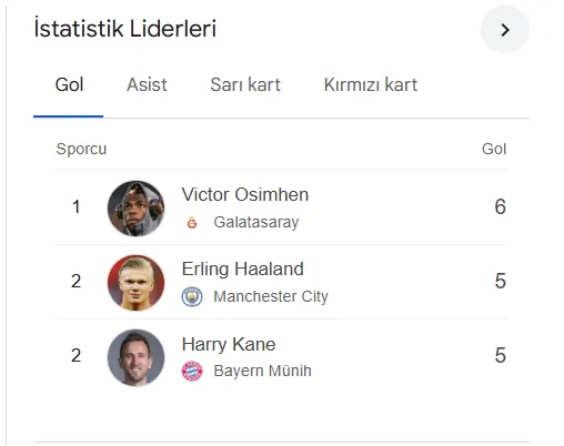 26 yaşındaki futbolcu böylece Şampiyonlar Ligi'nde 4. hafta sonunda gol krallığı yarışında zirveye yükseldi. Osimhen'i, 5'er gollü Kylian Mbappe, Harry Kane ve Erling Haaland takip ediyor.