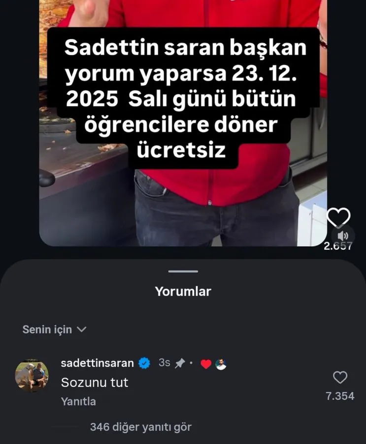 Sosyal medya kullanıcısı bir esnaf, “Sadettin Saran başkan yorum yaparsa 23 Aralık’ta bütün öğrencilere ücretsiz döner” paylaşımında bulundu.