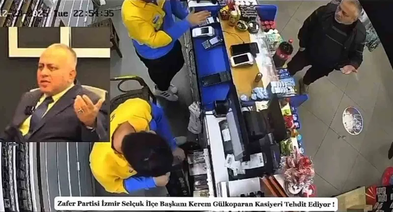 İzmir’de Zafer Partisi Selçuk İlçe Başkanı Kerem Gülkoparan’ın, ilçe girişinde bulunan bir benzin istasyonunun market bölümünde çalışan kasiyeri tehdit ettiği güvenlik kameralarına yansıdı.