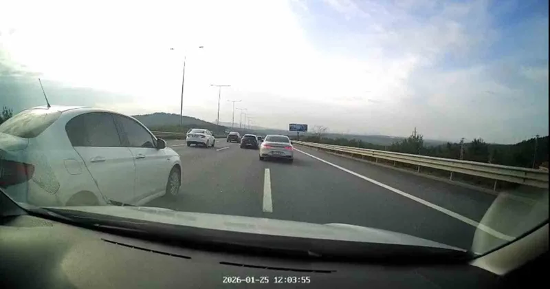 Beykoz’da Kuzey Marmara Otoyolu TEM bağlantı yolunda makas atan trafik magandası kazaya davetiye çıkardı. 34 FLC 606 plakalı otomobil sürücüsünün tehlikeli manevraları araç kamerasına yansıdı.