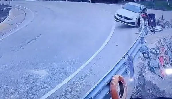 Uludağ yolundan şehir merkezine seyreden bir otomobil virajı alamayarak bariyerlere çarptı. O anlar güvenlik kamerasına yansıdı.