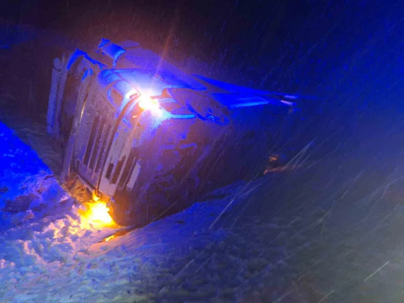 Bilecik’te seyir halinde kar yağışta kayan tır devrildi, sürücü yaralandı.