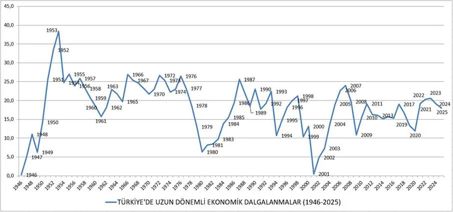 Bu çerçevede, grafikteki dip noktalara dikkatinizi çekmek istiyorum. Yani, 1946, 1961, 1980, 2001’ye. Bu yılların biraz öncesinde ve biraz sonrasındaki enflasyon, döviz kuru, büyüme, cari açık gibi ekonomik büyüklüklerle ilgili tartışmalara göz atmanızı rica ediyorum. Sonra da bugün tartıştığımız sorunları aklınızdan geçirmenizi isteyeceğim sizden.